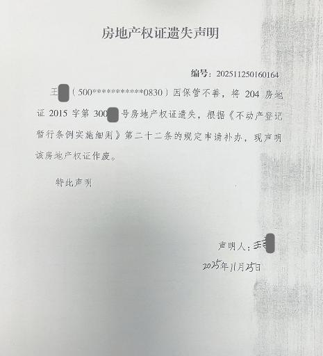 房地产权证遗失声明编号:202511250160164