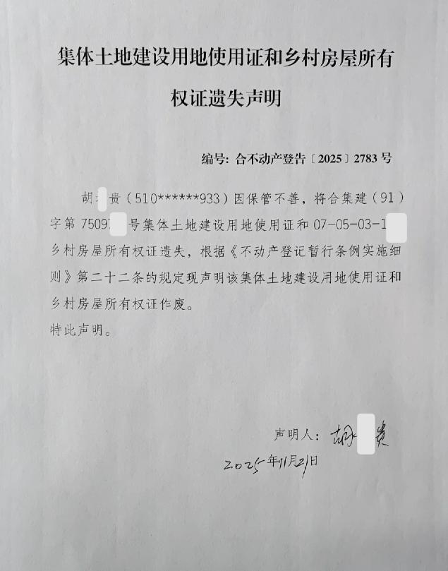 集体土地建设用地使用证和乡村房屋所有权证遗失声明编号:合不动产登告﹝2025﹞2783号