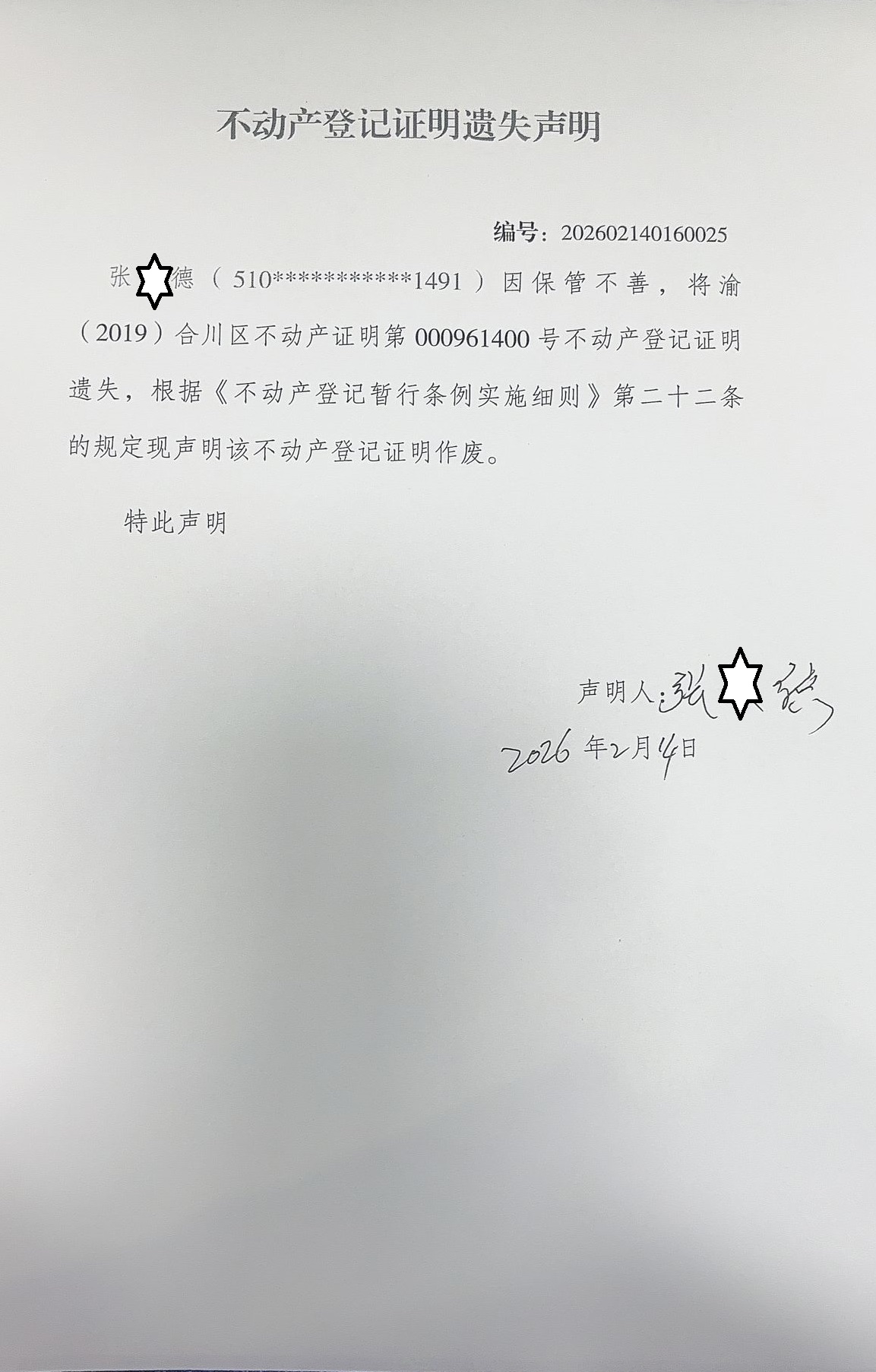 不动产登记证明遗失声明 编号:202602140160025