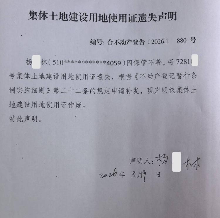 集体土地建设用地使用证遗失声明编号:合不动产登告﹝2026﹞ 880号
