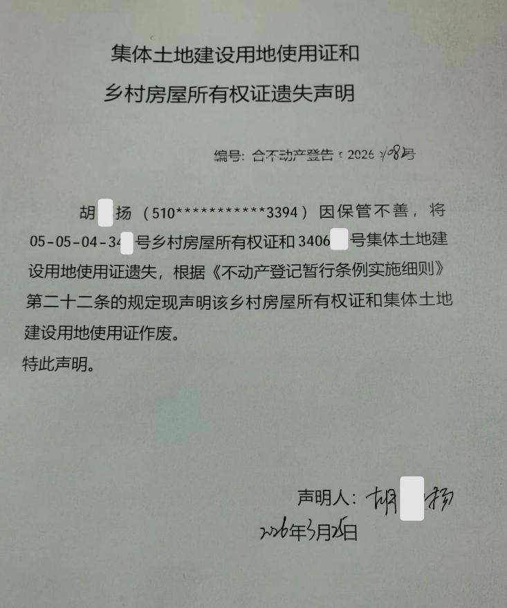 乡村房屋所有权证和集体土地建设用地使用证遗失声明编号:合不动产登告﹝2026﹞1082 号