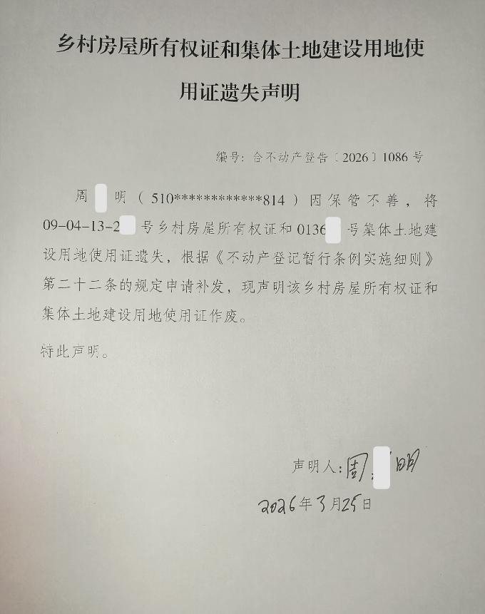 乡村房屋所有权证和集体土地建设用地使用证遗失声明编号:合不动产登告﹝2026﹞1086 号