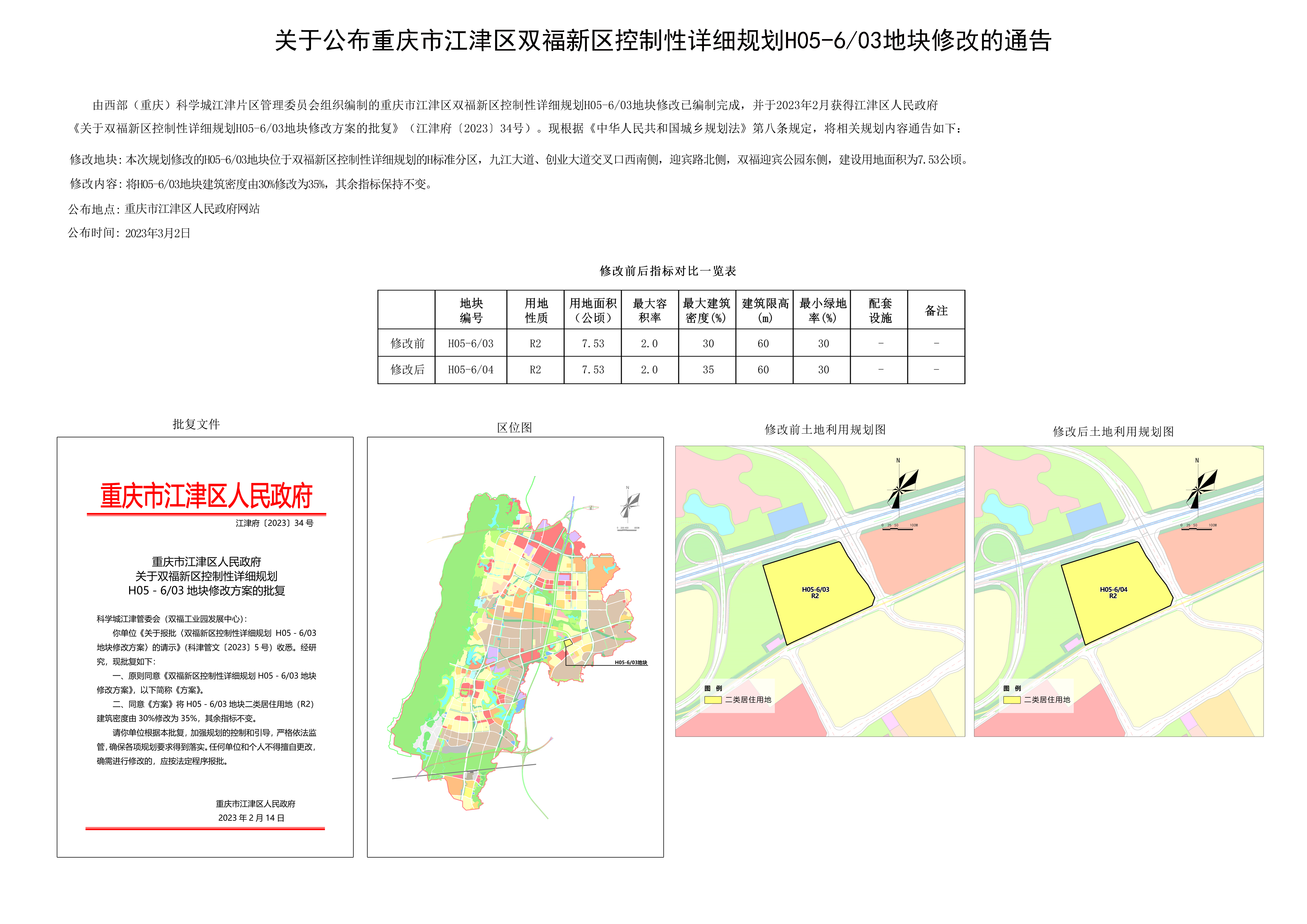 重庆市江津区双福新区控制性详细规划H05-6/03地块修改的通告