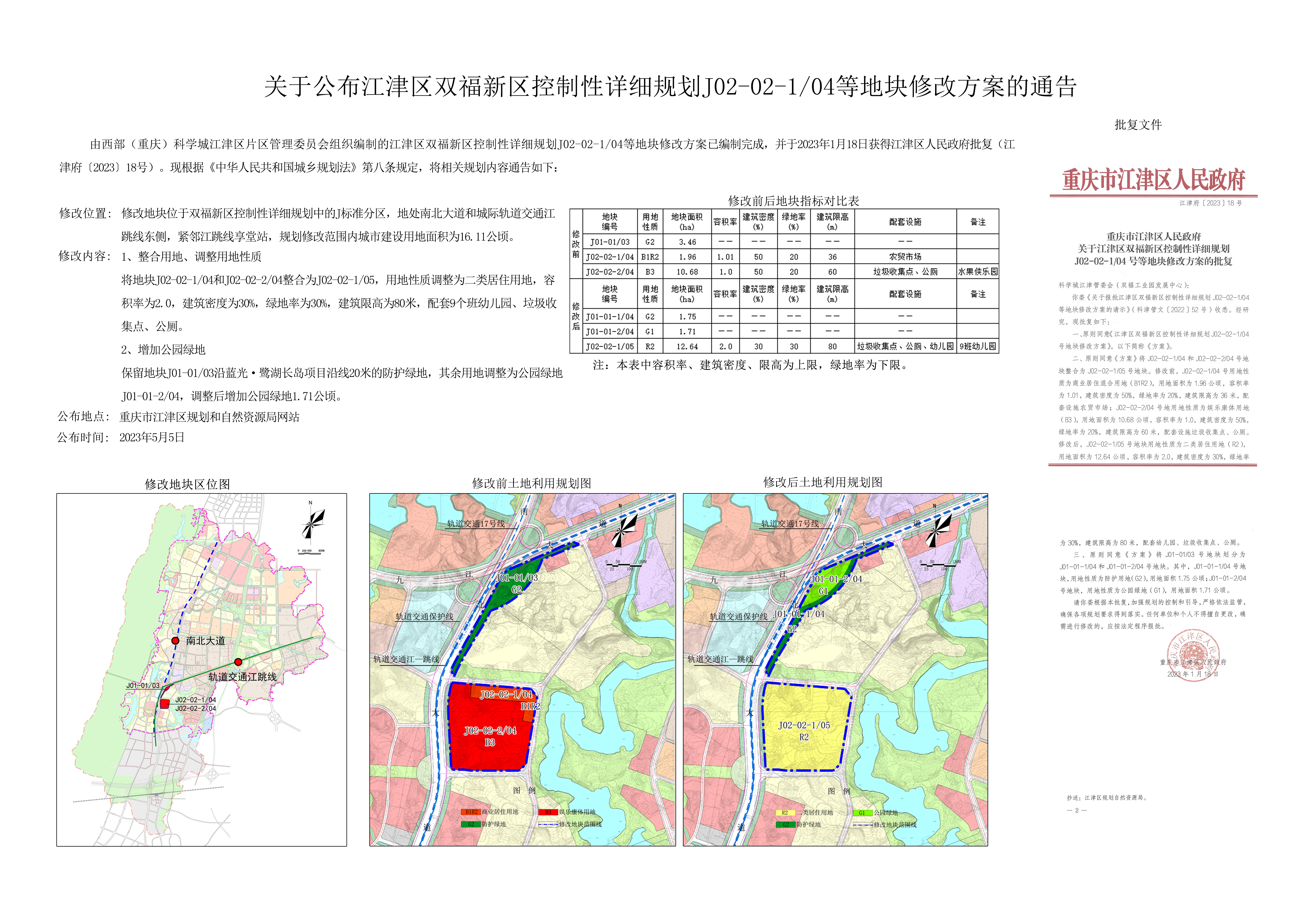 重庆市江津区双福新区控制性详细规划J02-02-1-04等地块修改方案公告