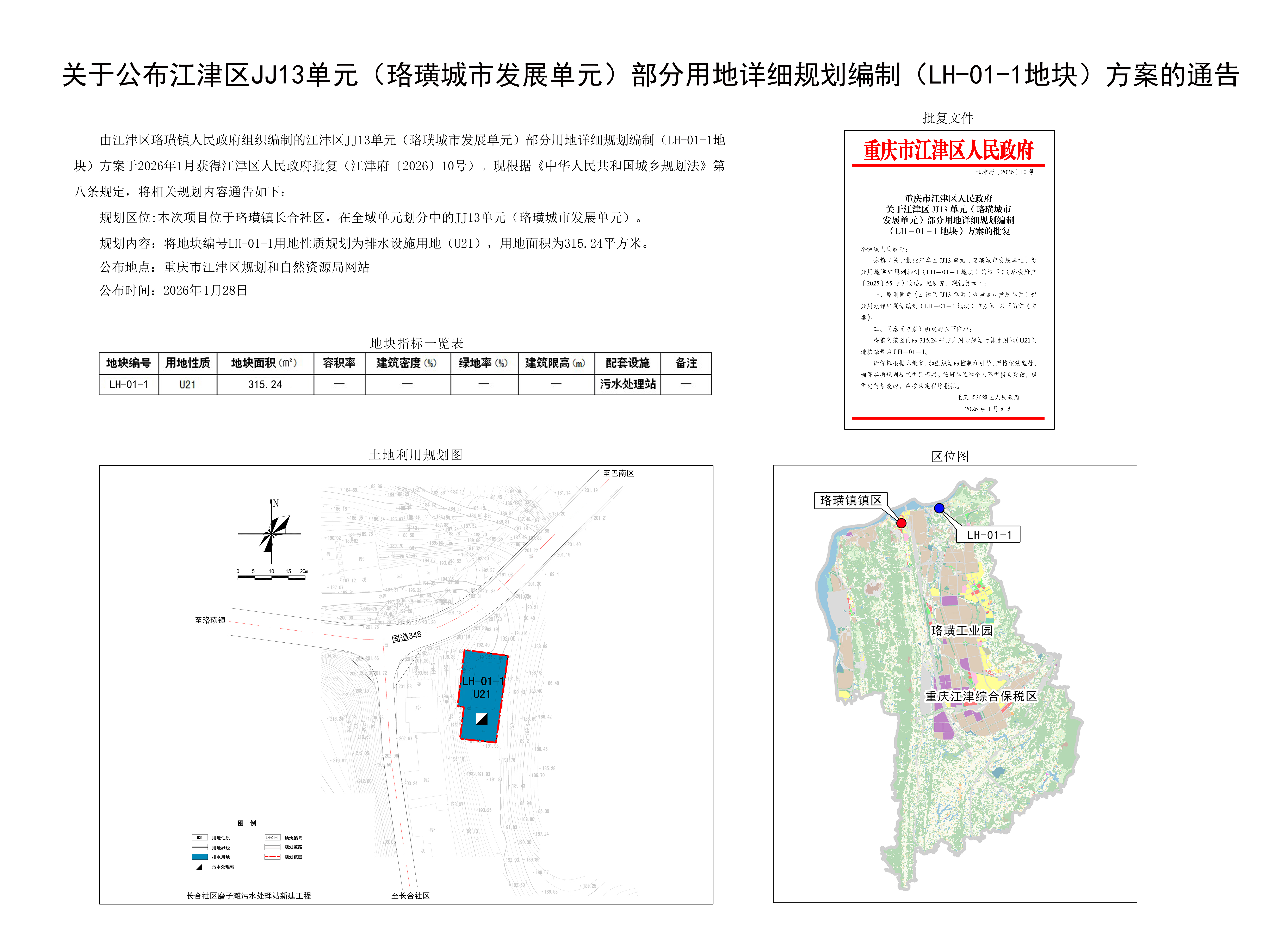 关于公布江津区JJ13单元(珞璜城市发展单元)部分用地详细规划编制(LH-01-1地块)方案的通告