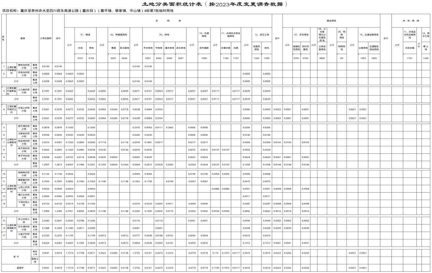 一、同意你单位临时使用嘉平镇寒坡村楒林沟村民小组等3个镇6个村17个村民小组集体土地3.9641公顷,其中集体农用地3.9418公顷(耕地1.7319公顷、含永久基本农田1.0631公顷,林地1.3752公顷)、集体建设用地0.0223公顷,作为重庆至贵州赤水至四川叙永高速公路(重庆段)(嘉平镇、蔡家镇、中山镇)4标第7批临时用地,主要用于该项目材料堆场0.0070公顷、施工便道3.9571公顷。