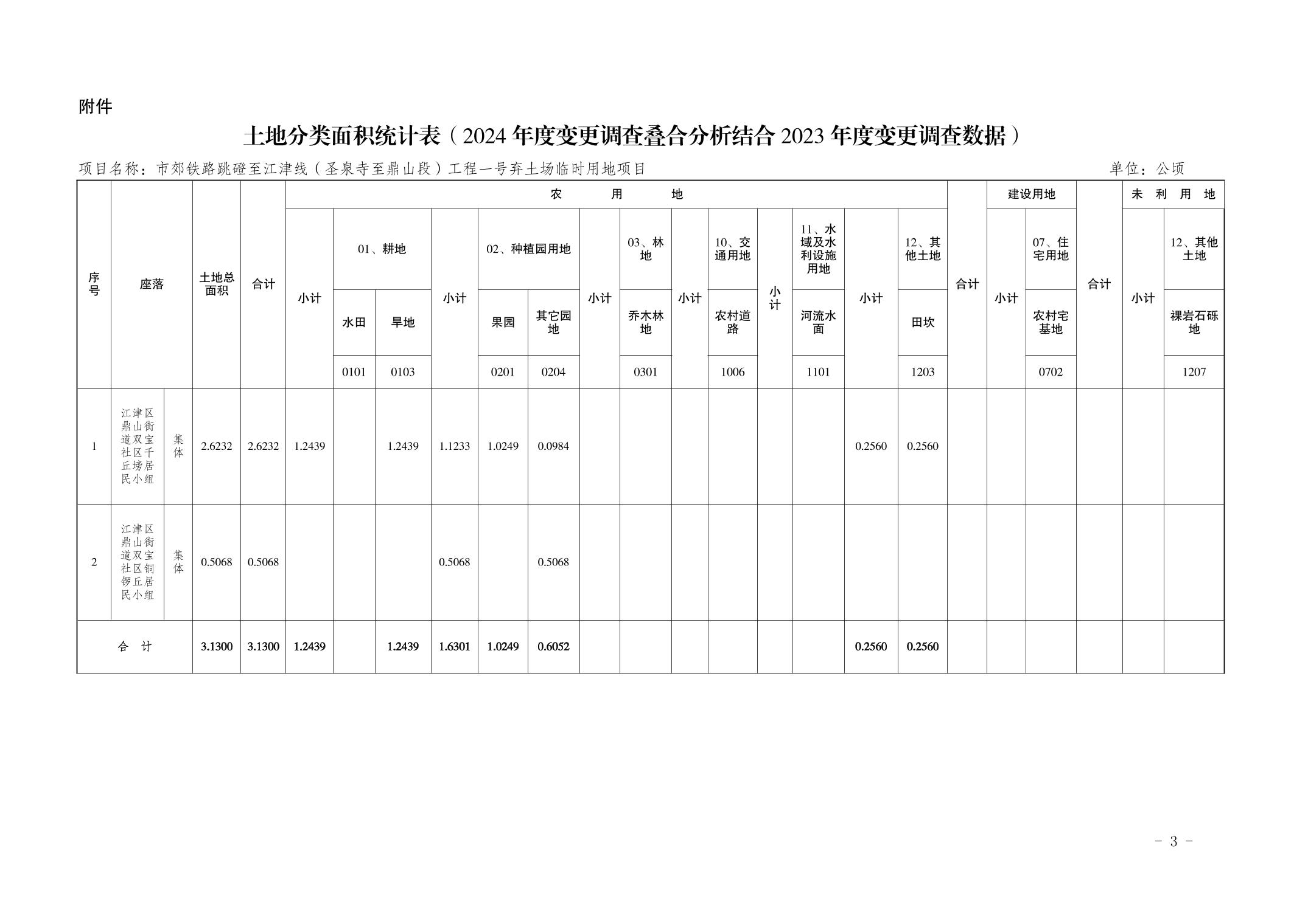 一、同意你单位临时使用江津区鼎山街道双宝社区千丘塝居民小组和铜锣丘居民小组集体土地3.1300公顷,其中集体农用地3.1300公顷(耕地1.2439 公顷),作为市郊铁路跳磴至江津线(圣泉寺至鼎山段)工程一号弃土场临时用地,主要用于该项目弃土(渣)场3.1300公顷。