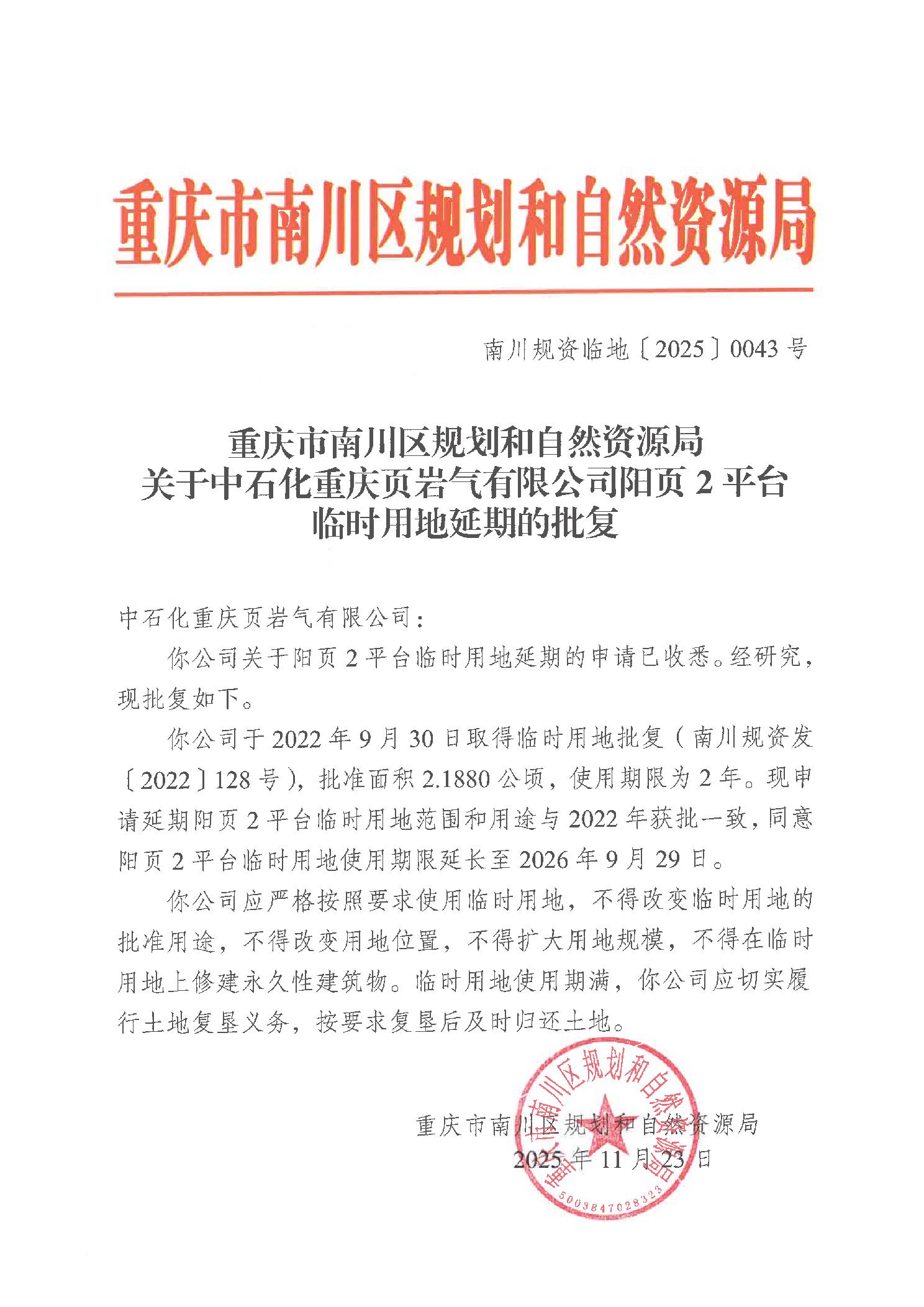 重庆市南川区规划和自然资源局关于中石化重庆页岩气有限公司阳页2平台临时用地延期的批复