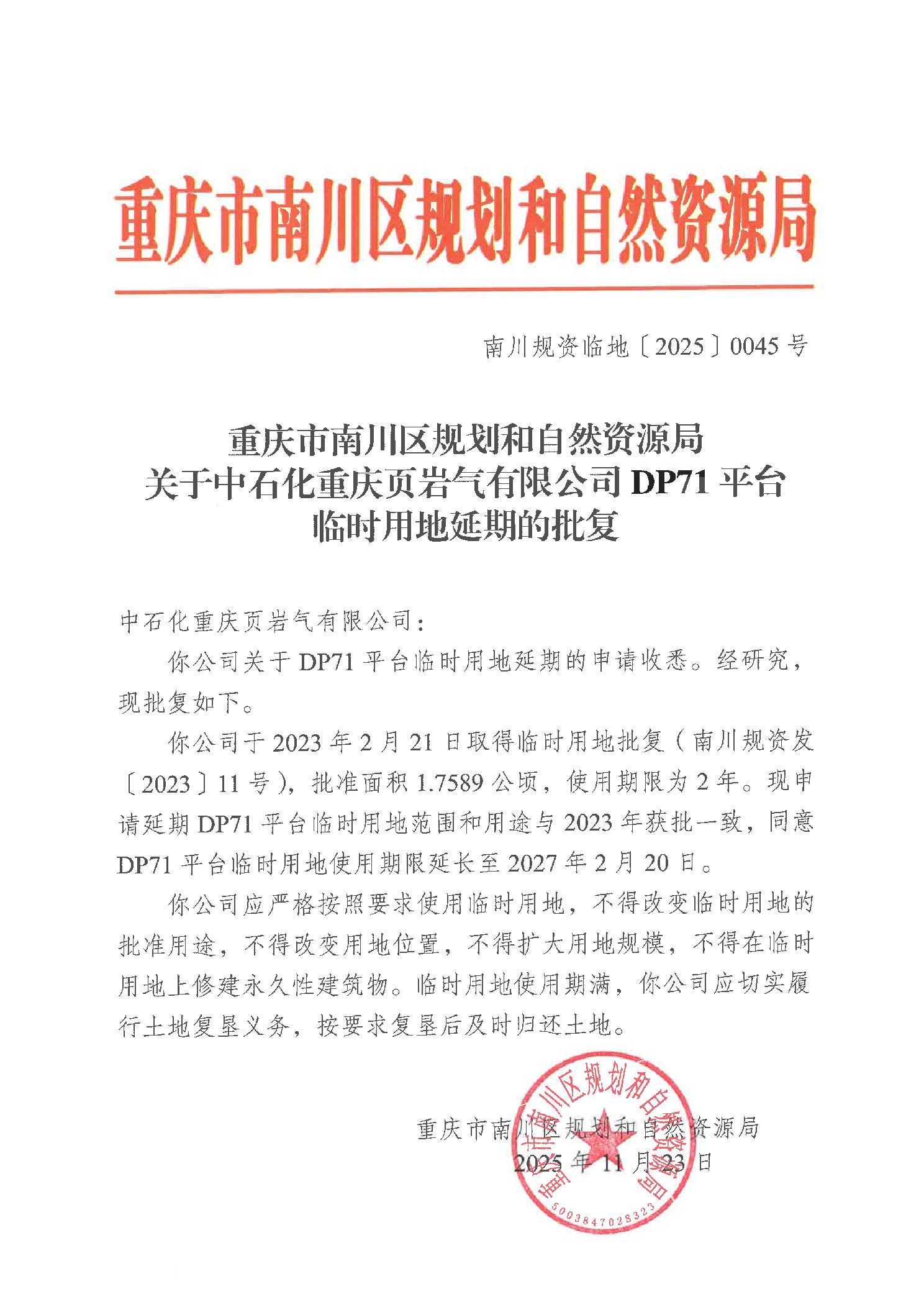 重庆市南川区规划和自然资源局关于中石化重庆页岩气有限公司DP71平台临时用地延期的批复