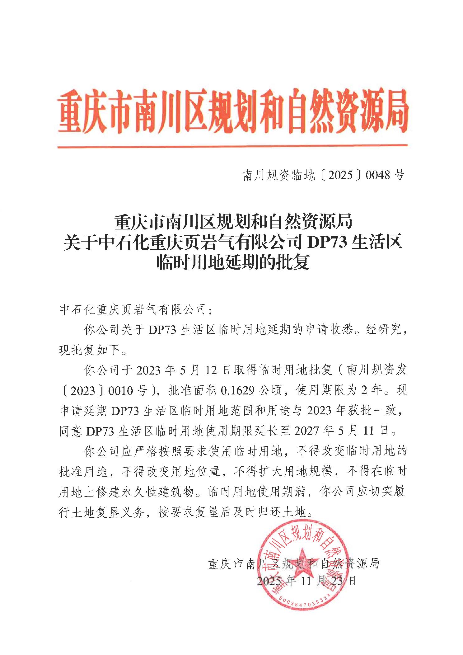重庆市南川区规划和自然资源局关于中石化重庆页岩气有限公司DP73生活区临时用地延期的批复