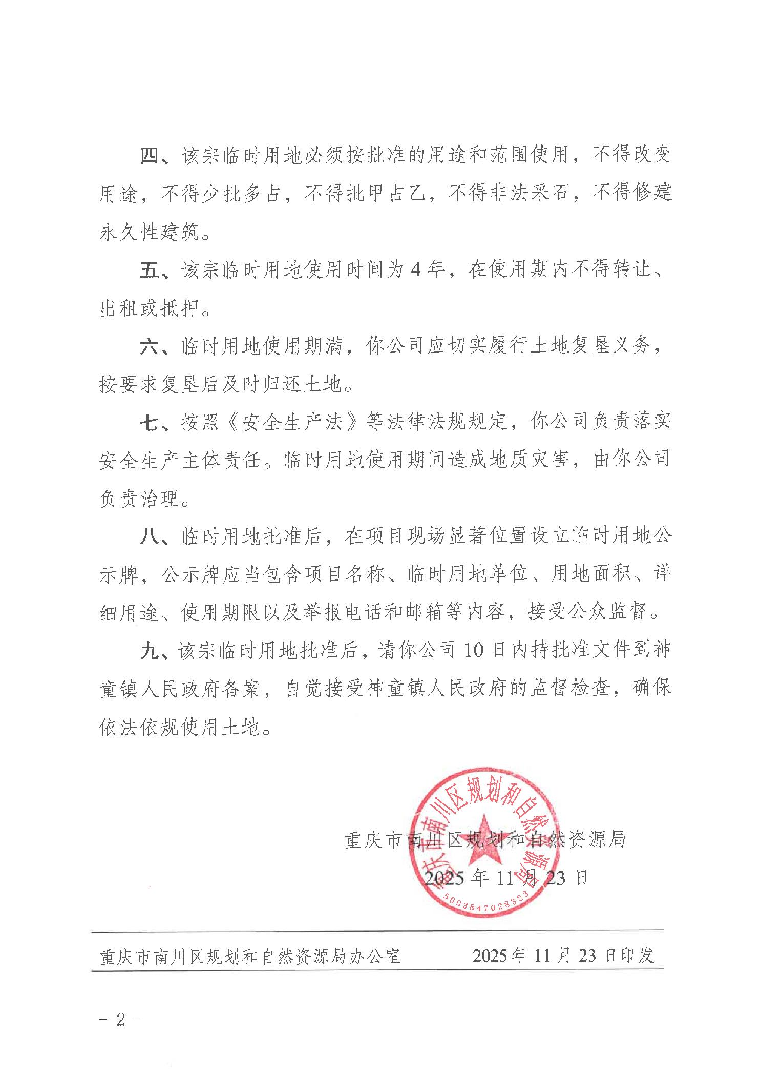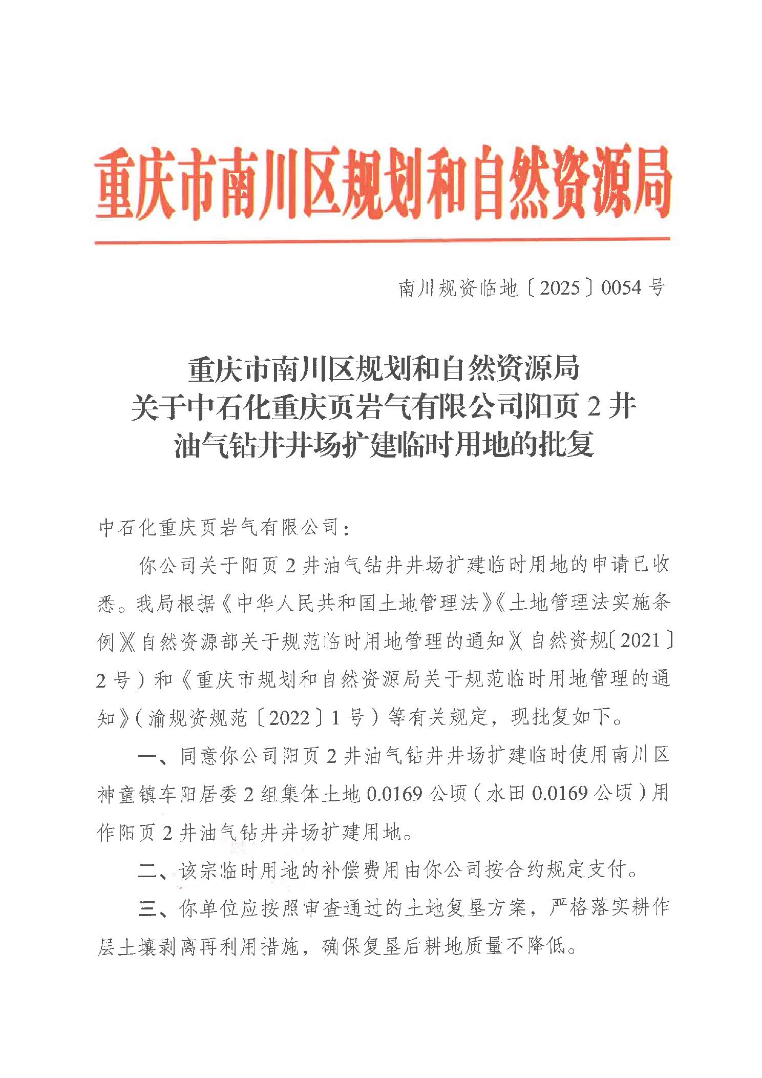 重庆市南川区规划和自然资源局关于中石化重庆页岩气有限公司阳页2井油气钻井井场扩建临时用地的批复