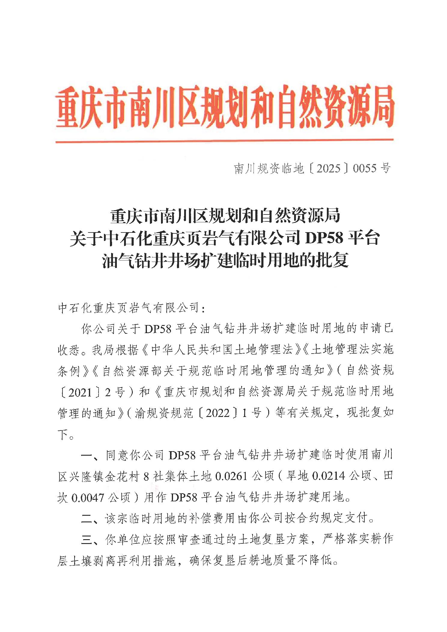 重庆市南川区规划和自然资源局关于中石化重庆页岩气有限公司DP58平台油气钻井井场扩建临时用地的批复