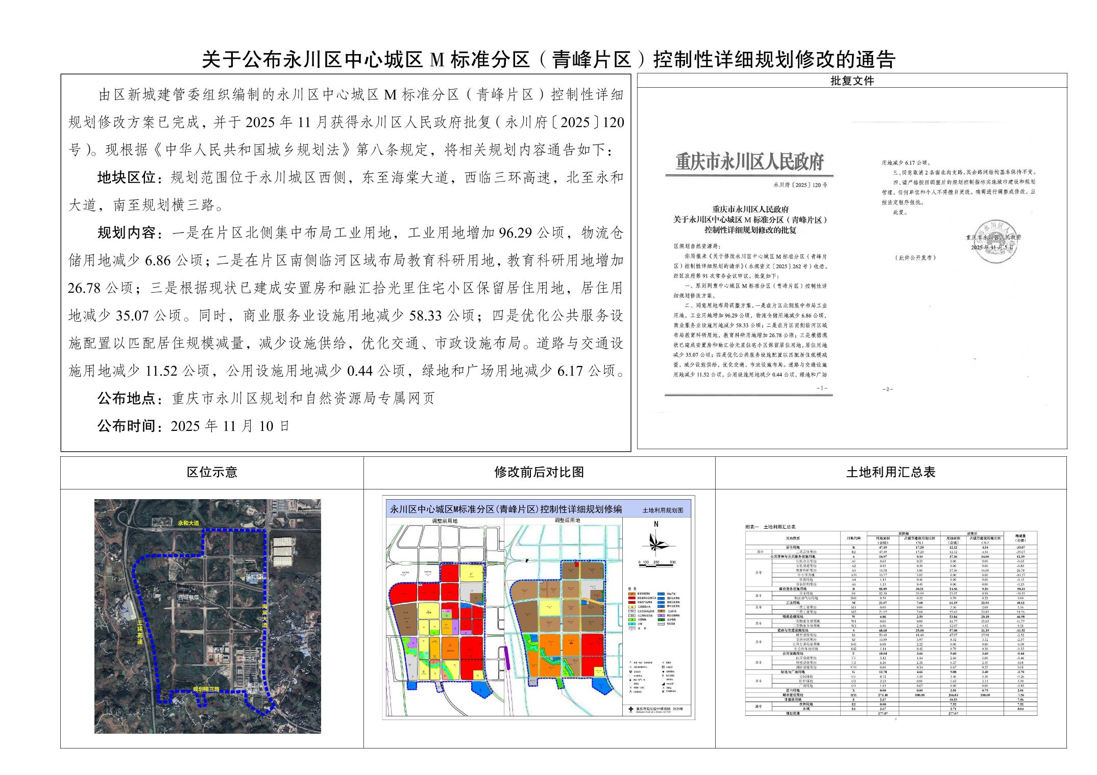 关于公布永川区中心城区M标准分区(青峰片区)控制性详细规划修改的通告